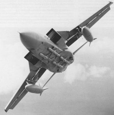| The Panavia ADV F3 version, with its wing fully swept back as it climbs up while banking right. Notice the four Sky Flash missiles on belly of fuselage. |